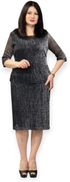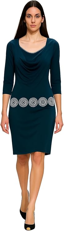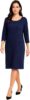 Elevate your wardrobe with this sophisticated navy blue cocktail dress that seamlessly blends comfort and style. The dress features an elegant scoop neckline and three-quarter length sleeves, perfect for various occasions. A subtle textured fabric pattern creates visual interest while providing a flattering silhouette. The knee-length cut offers a relaxed yet polished fit that drapes beautifully and moves with you. Versatile enough for both office wear and evening events, this dress maintains its shape throughout the day while offering easy movement. The classic navy color ensures year-round wearability and effortless accessorizing. With its straightforward pull-on style and quality construction, this dress eliminates complicated closures while maintaining a streamlined appearance. The timeless design transitions seamlessly from day to evening wear, making it a wardrobe essential. Pair with heels for a formal look or flats for a more casual approach. The dress features a comfortable 24-inch width and hits at the perfect spot for a professional yet fashionable appearance.
