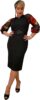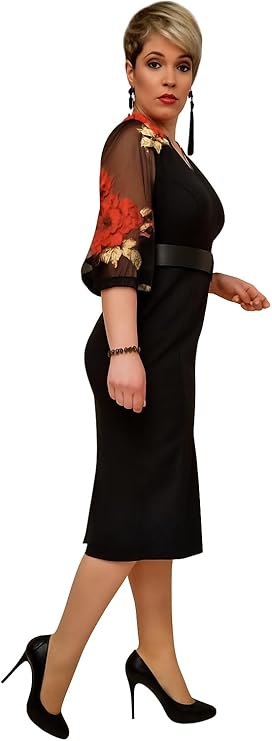 Make a stunning entrance in this sophisticated black cocktail dress that perfectly balances elegance with modern style. The dress features dramatic sheer mesh sleeves adorned with striking red and gold floral patterns, creating an eye-catching contrast against the classic black silhouette. The fitted bodice is complemented by a flattering belt detail that accentuates the waist, while the knee-length cut maintains a timeless appeal. The dress’s design seamlessly combines a modest neckline with contemporary details, making it versatile enough for various formal occasions. The sleek black fabric creates a slimming effect, while the statement sleeves add a touch of drama and flair. Perfect for cocktail parties, evening events, or special occasions, this dress can be styled with classic black heels and statement jewelry for a complete look. The comfortable fit and quality construction ensure you’ll feel as confident as you look throughout any event.