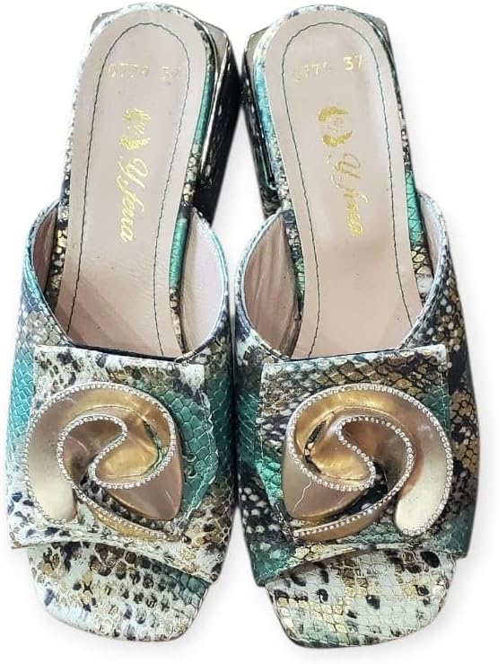 • LUXURIOUS DESIGN: Snake print leather mules featuring a stunning green and gold color scheme with crystal-adorned rose embellishment for sophisticated style