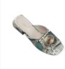 Women’s Snake Print Mule Sandals, Square Toe, Green and Gold with Crystal Rose Detail, Low 0.5″ Heel